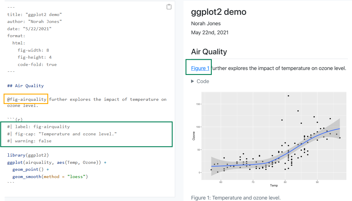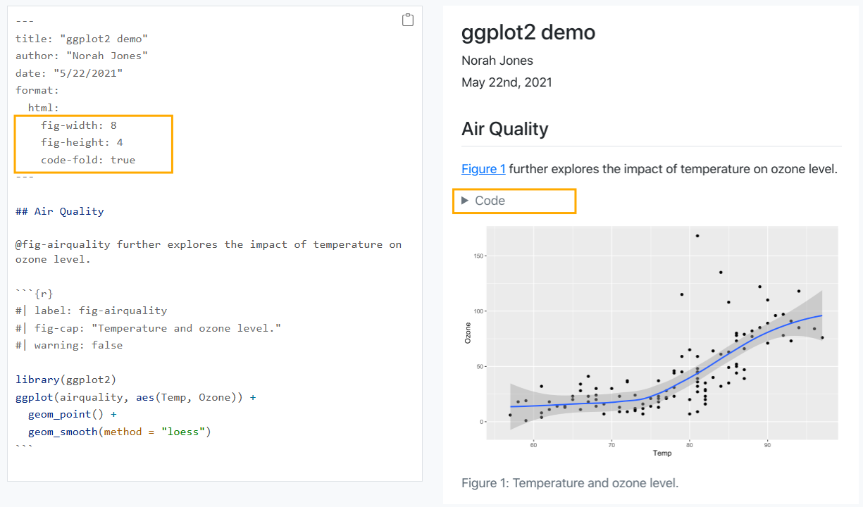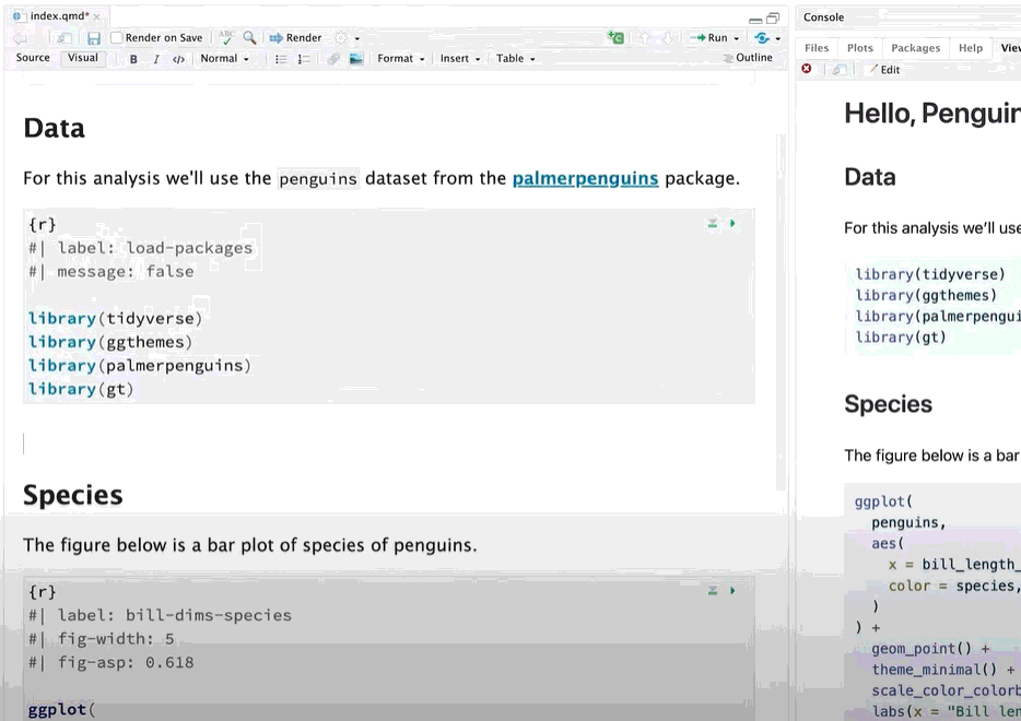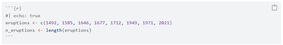 The echo option describes whether the code is included in the rendered article. If you make this change and save index.qmd, you’ll see this code now appears in the article.