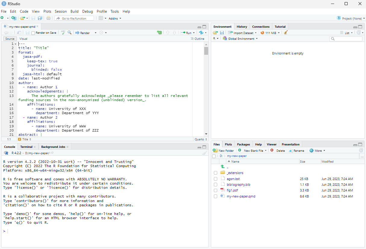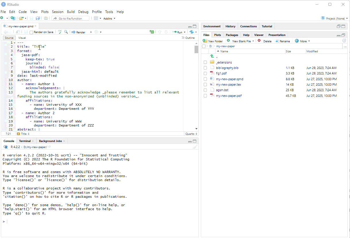 If you already have a peper of your own (with differnt r files with code) go to your RStudio Terminal and create a new project from scratch