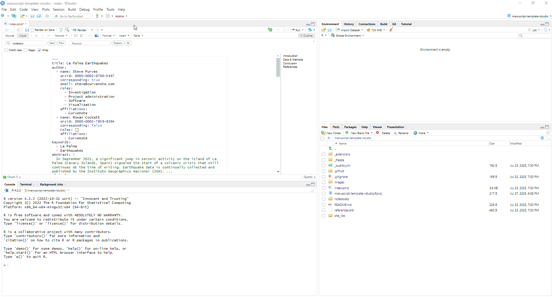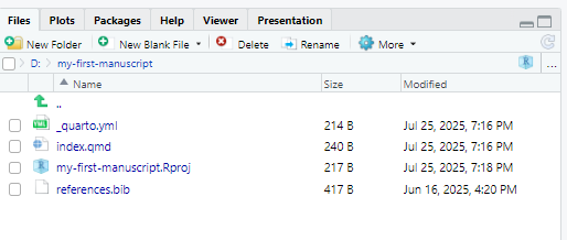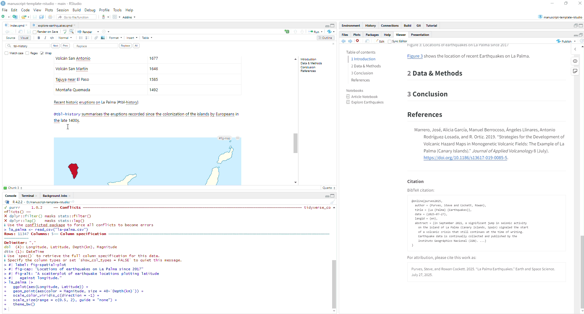 The basic workflow for writing a manuscript in Quarto is to make changes to your article content (the index.qmd if you are following the example), preview the changes with Quarto, and repeat.